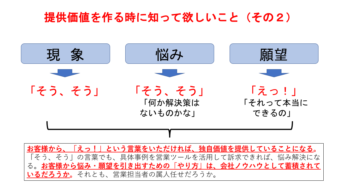 そして、悩みが顧客の担当者レベルの訴求、願望が経営幹部レベルの訴求と使い分けれるようになれば、提案力は飛躍的に高まります。(話す担当によって使い分ける感じです)
