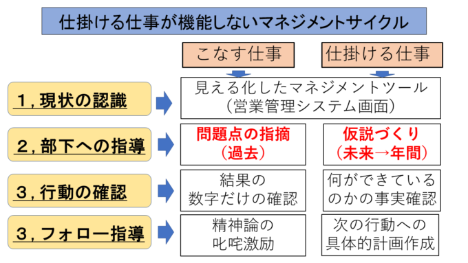 このステップ2の仮説づくり(年間)ができていないと、仕掛ける仕事においては、部下への指導が機能しないからです。