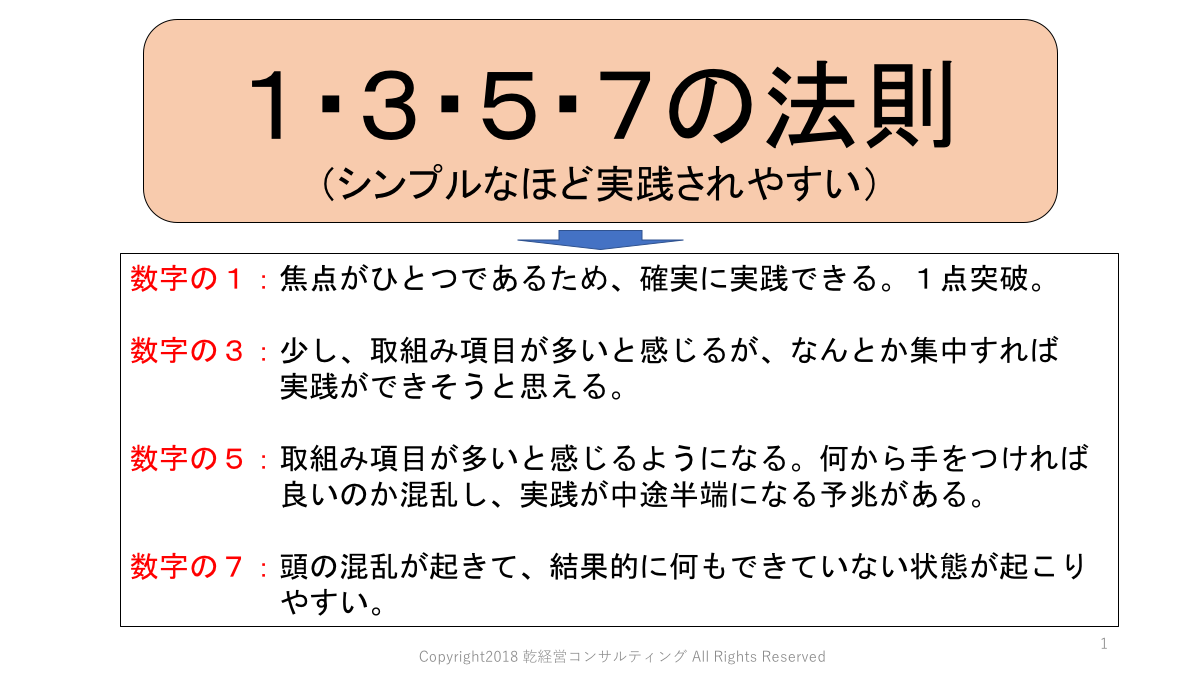中途半端ではなく、やり切れるビジネスモデルになっているでしょうか。やり切れるビジネスモデルのヒントは、1・3・5・7の法則です。